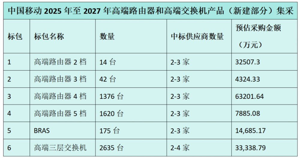 根据此前发布的招标公告,该项目集中采购产品为高端路由器、BRAS、高端三层交换机,预估采购规模高端路由器 3052 台、BRAS 设备 175 台、高端交换机 2635 台。预计本次采购需求满足期为两年。