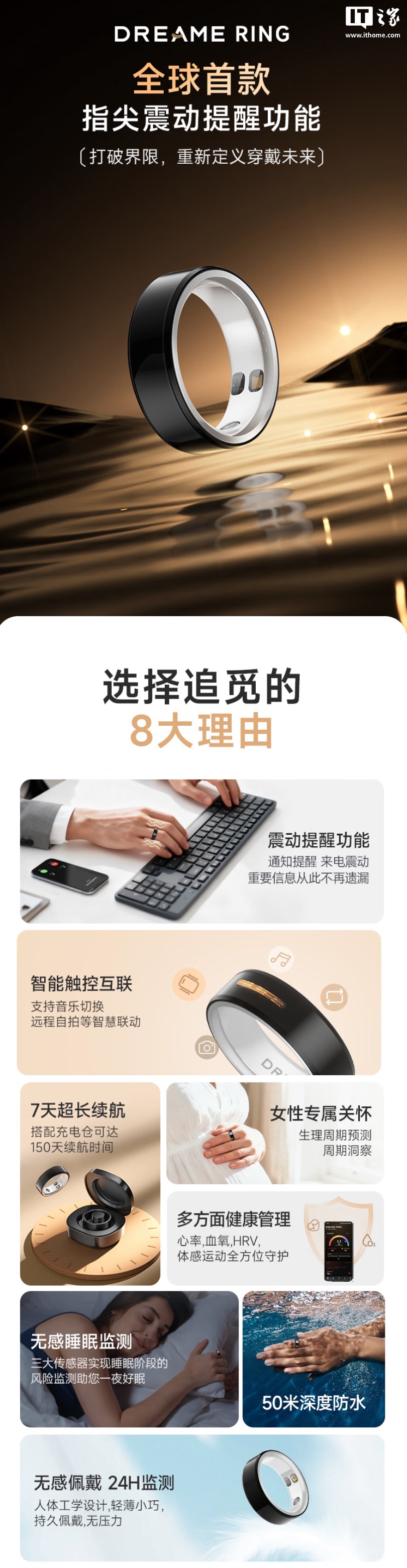 据介绍,该产品采用陶瓷材质,整体厚度 2.5mm,支持 5ATM 防水,提供通知提醒、来电震动、无声闹钟,内置无感睡眠监测、运动追踪、女性健康追踪技术。戒指本体提供 7 天续航,搭配充电盒可实现 150 天续航。