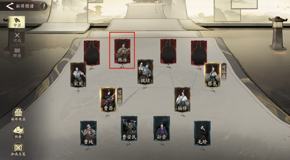 2.最重要的来了,尽可能的把红色品质的“韩浩”在第一时间点亮,他在副将图谱的这个位置;