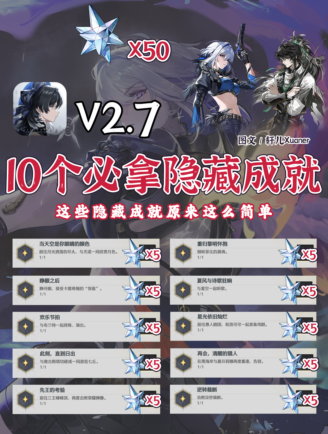 2.7上半共有10个隐藏成就:其中8个和黎那汐塔角色对话的成就,2个击败强大BOSS的成就。
