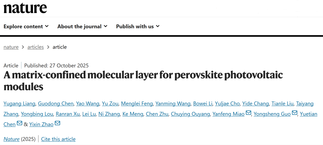 alixixi 10 月 28 日消息,据上海交通大学微信公众号消息,近日,《Nature》在线发表了上海交通大学环境科学与工程学院赵一新教授团队题为“A matrix-confined molecular layer for perovskite photovoltaic modules”的研究论文。该研究创新性地提出一种“基质限域分子层”型空穴传输层构型新概念,突破了传统自组装单分子层(SAM)型空穴传输层体系中面临的分子聚集、堆叠和结晶的本征限制,创制了分子适用性广、工艺推广性高的电荷传输层新技术路径,解决了基于自组装电荷传输层的钙钛矿光伏模组制备过程中面临的薄膜不均匀、界面不稳定难题。最终,通过与宁德时代 21C 创新实验室合作,该研究成功实现光电转换效率超过 20% 的 1 m × 2 m 大尺寸钙钛矿光伏模组,创造了当前该领域的世界纪录。