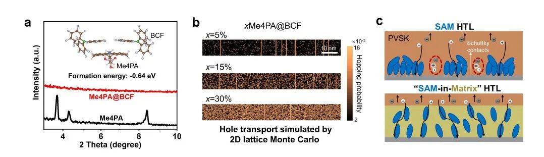 针对上述挑战,赵一新团队提出了一种“基质限域分子层”型空穴传输层结构的新思路,利用具有强吸电子能力与优异化学稳定性的三(五氟苯基)硼烷(BCF)分子构建主体骨架,将空穴传输分子分散于 BCF 基质中,形成类似于“枣糕结构”的传输层。该结构首先容易形成厚度可控的空穴传输覆盖层,密度泛函计算揭示 BCF 骨架分子与空穴传输分子间的强相互作用有效抑制了 SAM 结构中空穴传输分子的堆叠倾向与聚集行为。二维蒙特卡洛模拟指出,在该厚度可调的分子层结构中,少量空穴传输分子即可实现和理想无堆叠 SAM 一样的高效空穴传输。该基质限域分子层-钙钛矿层界面还兼具良好的化学稳定性与较低的界面复合损失。“基质限域分子层”型空穴传输层更体现了优异的浸润性,其致密的埋底界面保形覆盖能显著提升大面积薄膜的结晶质量与均匀性。