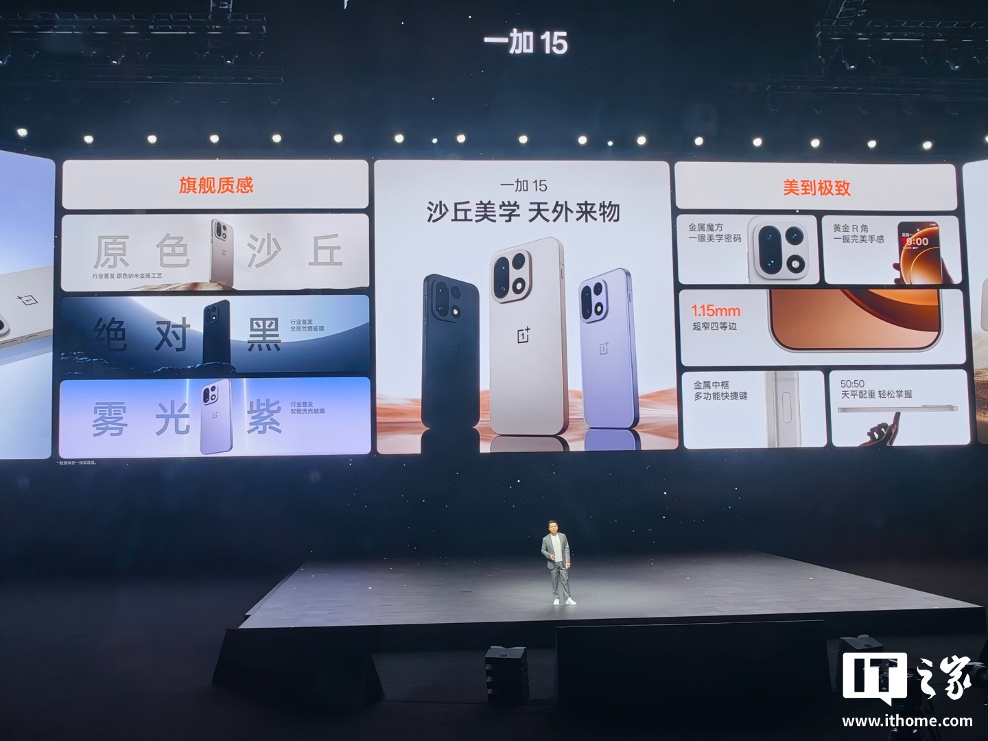 一加 15 手机采用全新一代旗舰设计「沙丘美学」、配金属魔方 Deco + 黄金大 R 角 + 1.15mm 超窄四等边 + 50:50 天平配重 + 金属中框 + 多功能快捷键等,提供原色沙丘(行业首发「原色纳米金属工艺」)、绝对黑(行业首发「全哑丝绸玻璃」)、雾光紫(行业首发「双维流光玻璃」)三款配色。