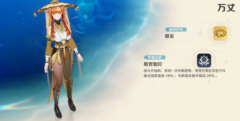 如果大家用的是万丈这个角色的话,他的心像搭配上面,专属法则效果是可以在战斗一开始的时候就发动攻击的,这里的话可以使我方单位在攻击的情况下,魔法强度得到足够大的提升,而且带来的光明精灵效果还有额外的加成,很适合被一些光明流派的角色一起进行搭配使用,所以在不同的角色他的心像能力上面都有不同的效果,当然这里心像上面一定是有一个护符以及一个技能进行组成,才可以达成全称的心像效果。