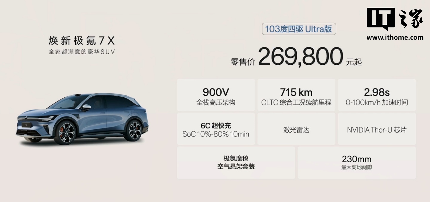新车升级全栈 900V 高压架构,可在 10 分钟内从 10% 电量充至 80%,CLTC 续航里程最长可达 802km;双电机车型零百加速仅需 2.98 秒,四驱电机峰值功率 585kW,最高车速 255km/h。同时,新车还拥有“极氪魔毯”空气悬架套装,据官方介绍包含闭式空气悬架、CCD 电磁减震系统(103 度四驱 Ultra 版)。