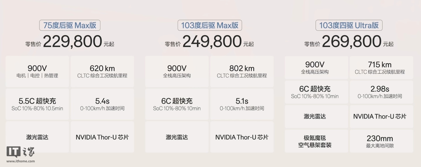 103 度四驱 Ultra 版:585kW 双电机,零百加速 2.98 秒,续航 715km,空气悬架,零售价 26.98 万元