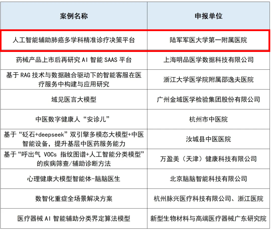本届活动征集面向全球,来自中国内地、中国香港、中亚等多个地区的申报案例507项,覆盖大模型、生成式人工智能、智能体、具身智能等前沿技术,以及能源、金融、医疗、信息通信、汽车等34个重点行业,从技术创新性与产业实效性等维度综合考量,最终遴选出20个具有代表性的典型案例。"人工智能辅助肺癌多学科精准诊疗决策平台"项目是医疗专项唯一入选的20个具有代表性的典型案例之一。同时AIIA专家再次遴选具有代表性的十佳典型医疗案例,充分展现人工智能赋能医疗健康行业的创新活力与应用深度,该项目排名第一。