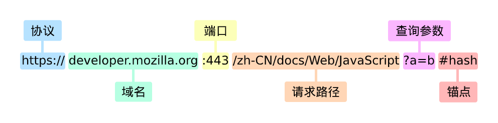 以 MDM 的一个文档地址为例,看看 URL 不同的组成部分:https://developer.mozilla.org:443/zh-CN/docs/Web/JavaScript?a=b#hash