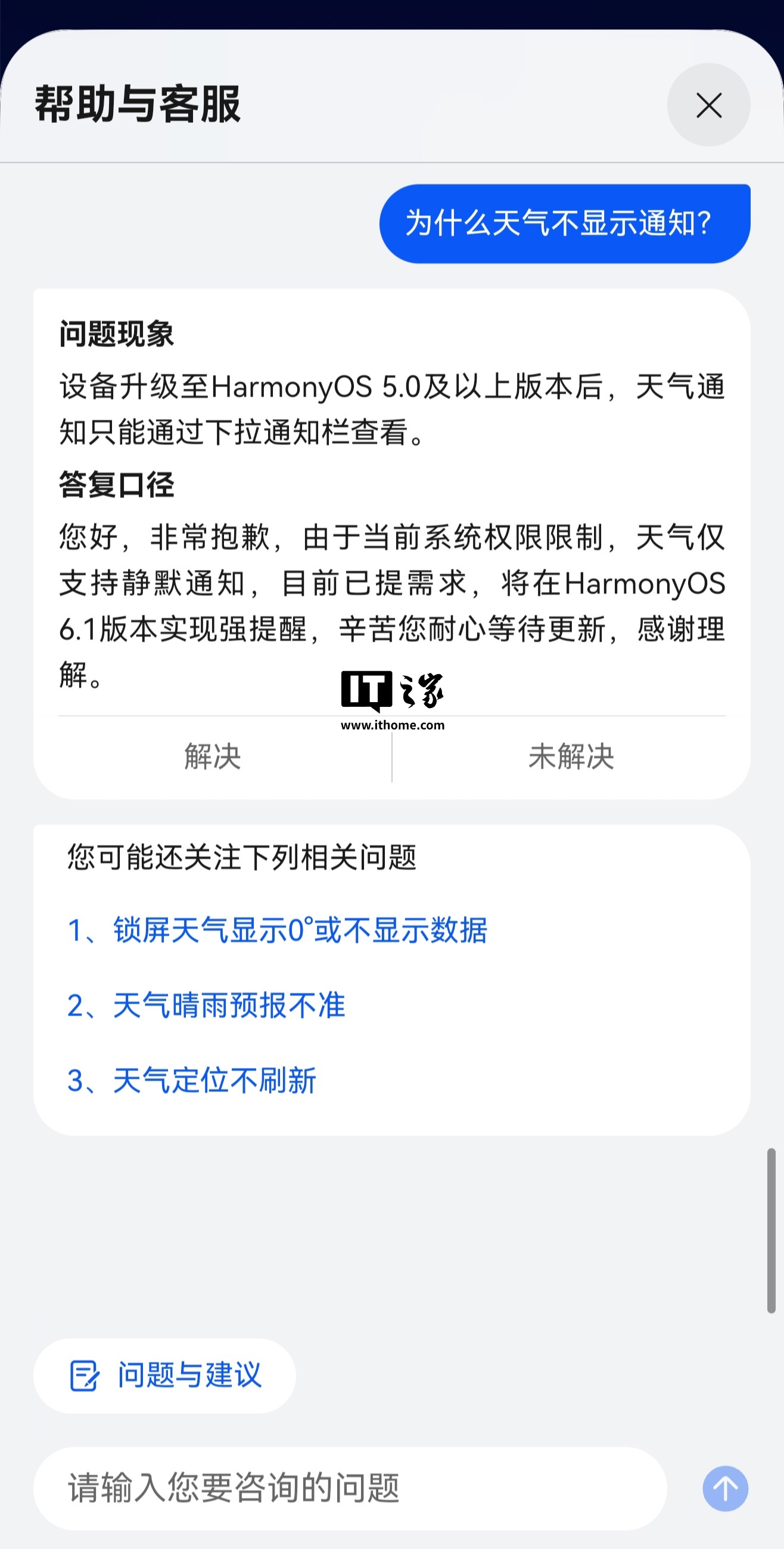 alixixi注意到,目前鸿蒙 HarmonyOS 6.1 版本已露出“冰山一角”,华为天气 App 的“帮助与客服”板块显示,设备升级至 HarmonyOS 5.0 及以上版本后,天气通知只能通过下拉通知栏查看。该问题解决方法如下: