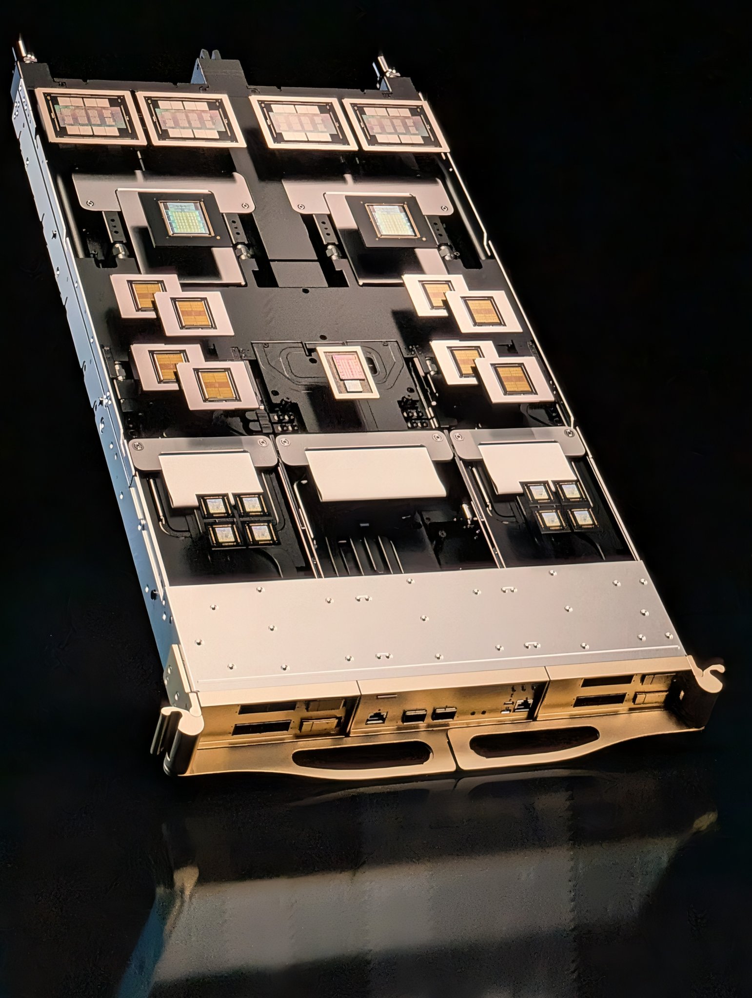 其主板整合了一颗 Vera CPU 与两颗巨大的 Rubin GPU,并配备了最多 32 个 LPDDR 内存插槽,同时 GPU 上还将采用 HBM4 高带宽显存。