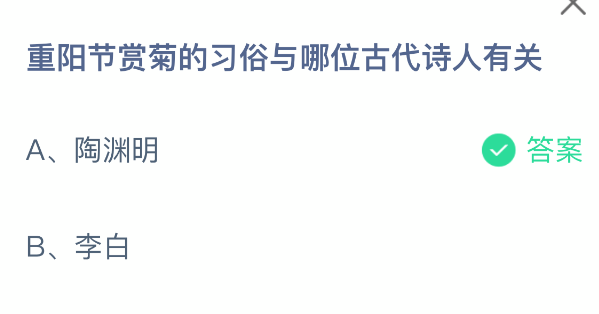 重阳节赏菊的习俗与哪位古代诗人有关?支付宝小鸡课堂开课啦!每天花一分钟答题赚饲料,喂喂小鸡就能贡献爱心啦!轻松又意义十足!2025年10月29日蚂蚁庄园的小鸡课堂题目正确答案是【陶渊明】,晋代陶渊明爱菊典故推动风尚形成,唐宋时期正式成为重阳节俗.