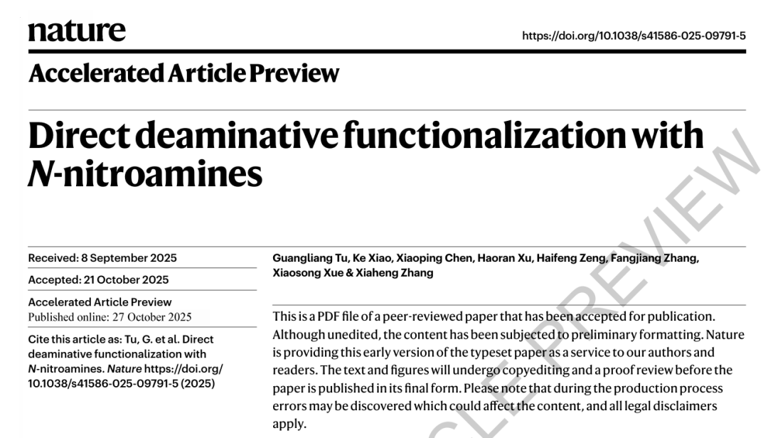 alixixi 10 月 29 日消息,国际权威期刊 Nature 于北京时间 10 月 28 日发表了中国科学院大学杭州高等研究院(杭高院)化学与材料科学学院(化材学院)研究员张夏衡团队最新成果 ——“Direct deaminative functionalization with N-nitroamines”。