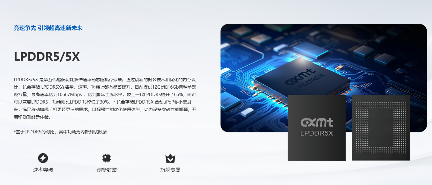 LPDDR5/5X 是第五代超低功耗双倍速率动态随机存储器。通过创新的封装技术和优化的内存设计,长鑫存储 LPDDR5X 在容量、速率、功耗上都有显著提升,目前提供 12Gb 和 16Gb 两种单颗粒容量,最高速率达到 10667Mbps ,达到国际主流水平,较上一代 LPDDR5 提升了 66%,同时可以兼容 LPDDR5,功耗则比 LPDDR5 降低了 30%。长鑫存储 LPDDR5X 首创 uPoP 小型封装,满足移动旗舰手机更轻更薄的需求,以超强性能优化使用体验,助力设备突破性能瓶颈,开启移动智能新体验。
