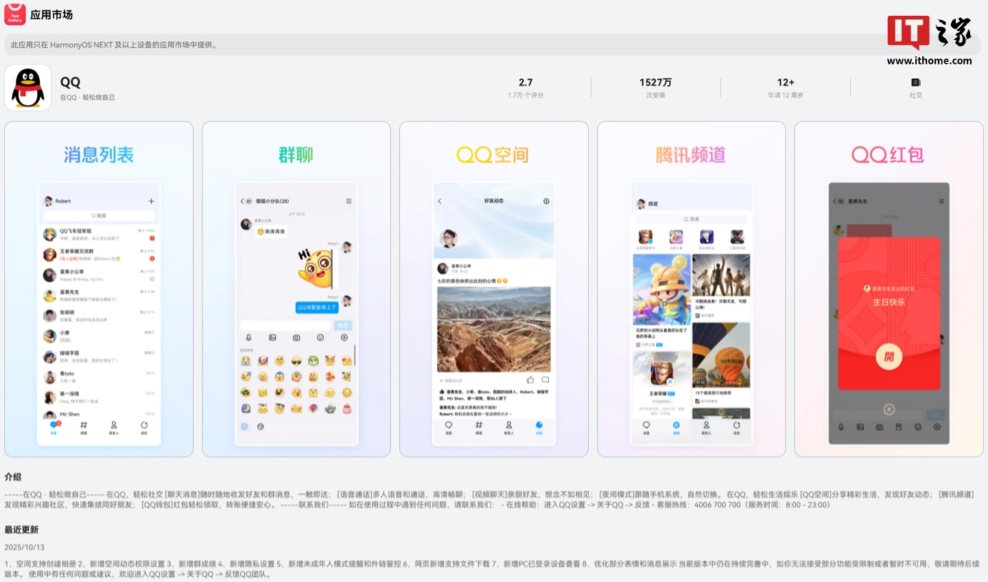 QQ 鸿蒙版 App 于去年 10 月上架 HarmonyOS NEXT 华为应用市场 App Gallery 尝鲜专区,当前版本号为 9.1.75(正式版本),安装量突破 1527 万、获 1.7 万个评分(评分 2.7),已支持单聊、群聊、多人语音或视频通话、抢红包,刷空间好友动态、短视频、频道、扫一扫、手机 / 平板双端登录等功能,官方称其他功能正在持续迭代中。
