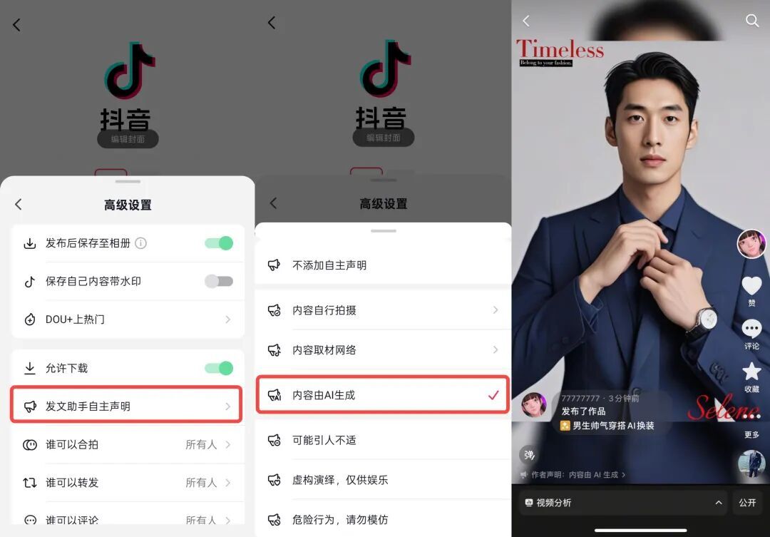 2025 年 9 月,抖音根据《互联网信息服务深度合成管理规定》《生成式人工智能服务管理暂行办法》《人工智能生成合成内容标识办法》等法律法规及国家标准要求,以及《“抖音”用户服务协议》《抖音社区自律公约》等相关平台规则,发布《抖音关于升级 AI 内容标识功能的公告》,协助创作者理解抖音 AI 内容标识规则,通过 AI 内容标识提醒用户辨别虚假信息,维护抖音用户及创作者的合法权益,使 AIGC 技术更好服务于社会。