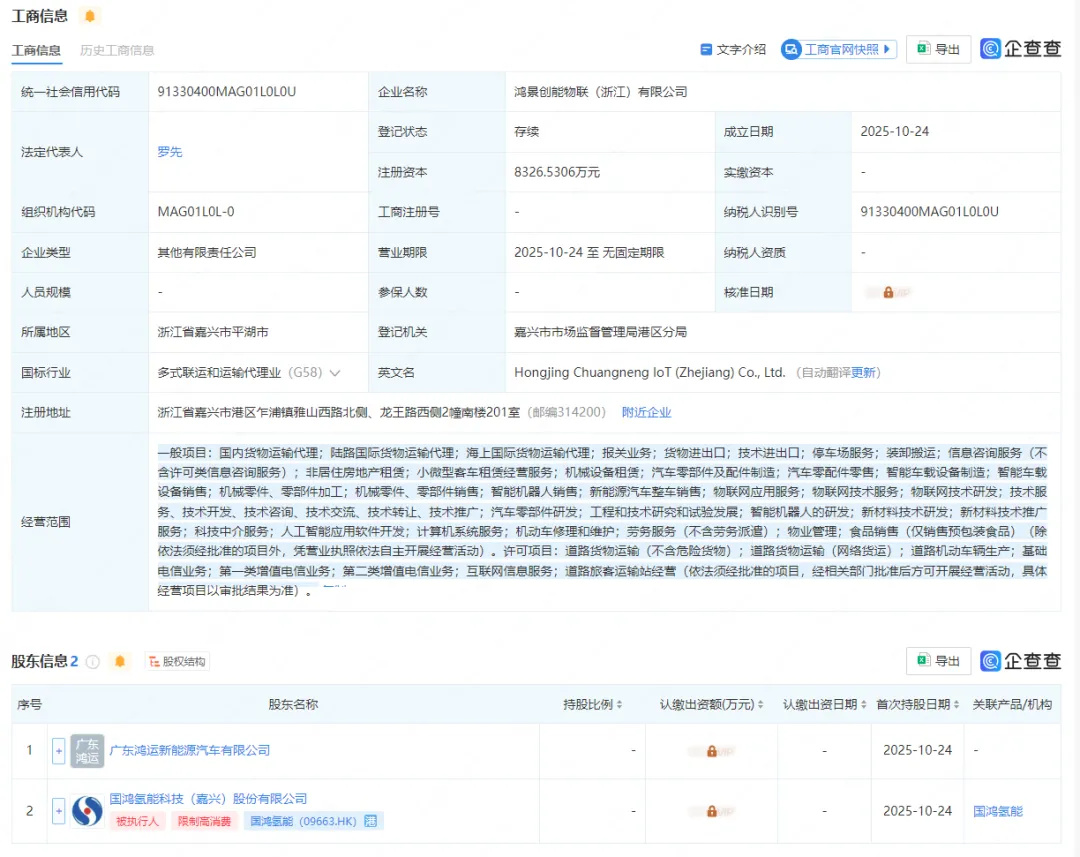 股东信息显示,鸿景创能物联(浙江)有限公司由广东鸿运新能源汽车有限公司与国鸿氢能科技(嘉兴)股份有限公司共同持股,持股比例暂未公布。