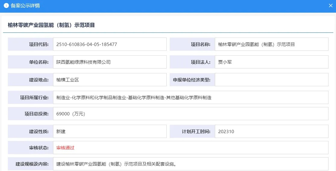 10月24日,陕西政务服务网(投资项目在线审批监管平台2.0)显示:榆林零碳产业园氢能(制氢)示范项目备案审核通过。