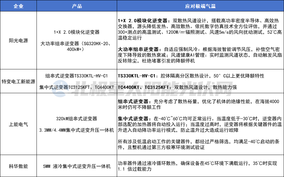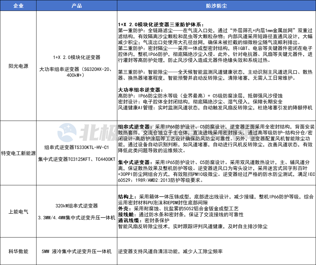 而特变电工新能源、上能电气还有科华数能,同样强调了高等级防护、防腐设计,全密封结构以及自动反转除尘和风道自清洁功能(详见下表)。