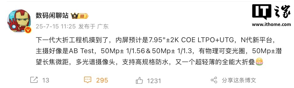 该博主还曾在今年 7 月透露,目前已摸到某厂商下一代工程机,该机将配备 7.95 英寸 2K 分辨率 COE LTPO+UTG 内屏,正在测试 50MP 1/1.56 英寸及 50MP 1/1.3 英寸两种规格 CMOS 主摄,同时相应机型还配有物理可变光圈、50MP 潜望长焦微距及多光谱摄像头,支持高规格防水。