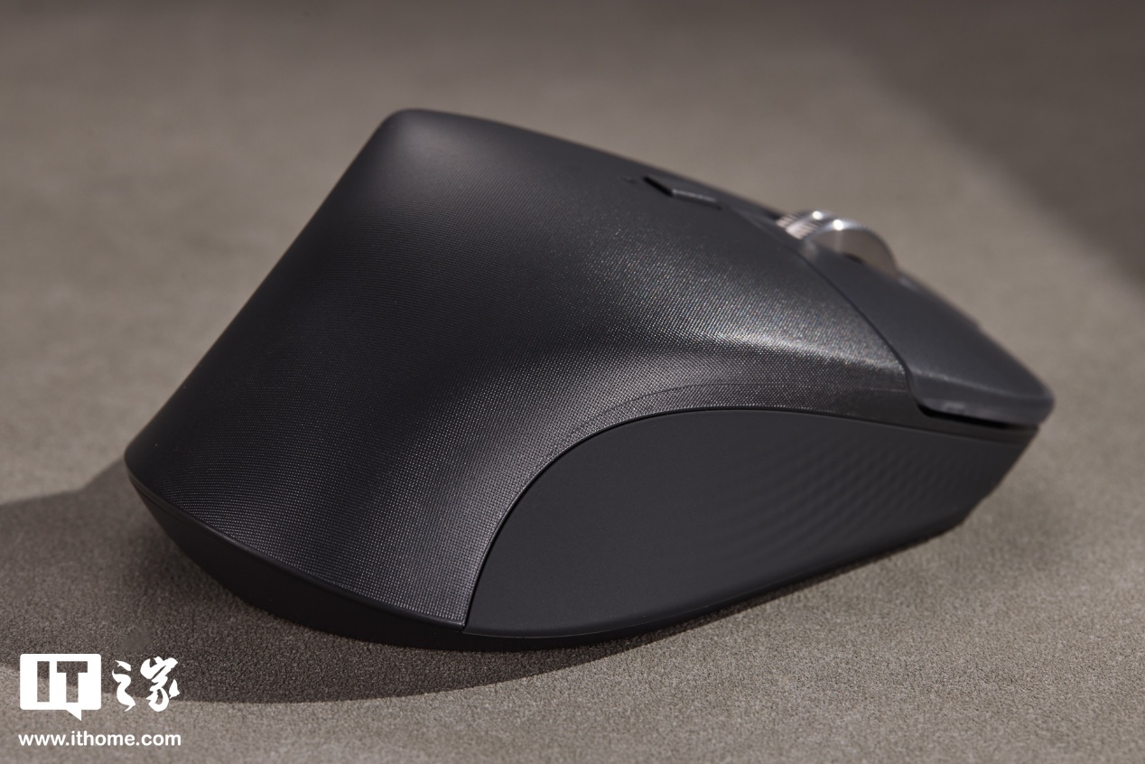 来到侧面,罗技大师系列 MX MASTER 4 的抓握区细节满满,配置带有精雕纹理的抗污柔软硅胶,以及全新触觉反馈面板、三个侧边长条按键。