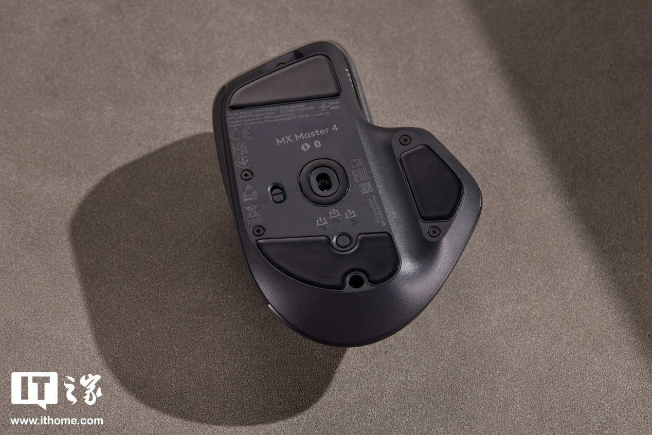 来到鼠标底部,可以更直观地看到 MX MASTER 4 的做工细节。