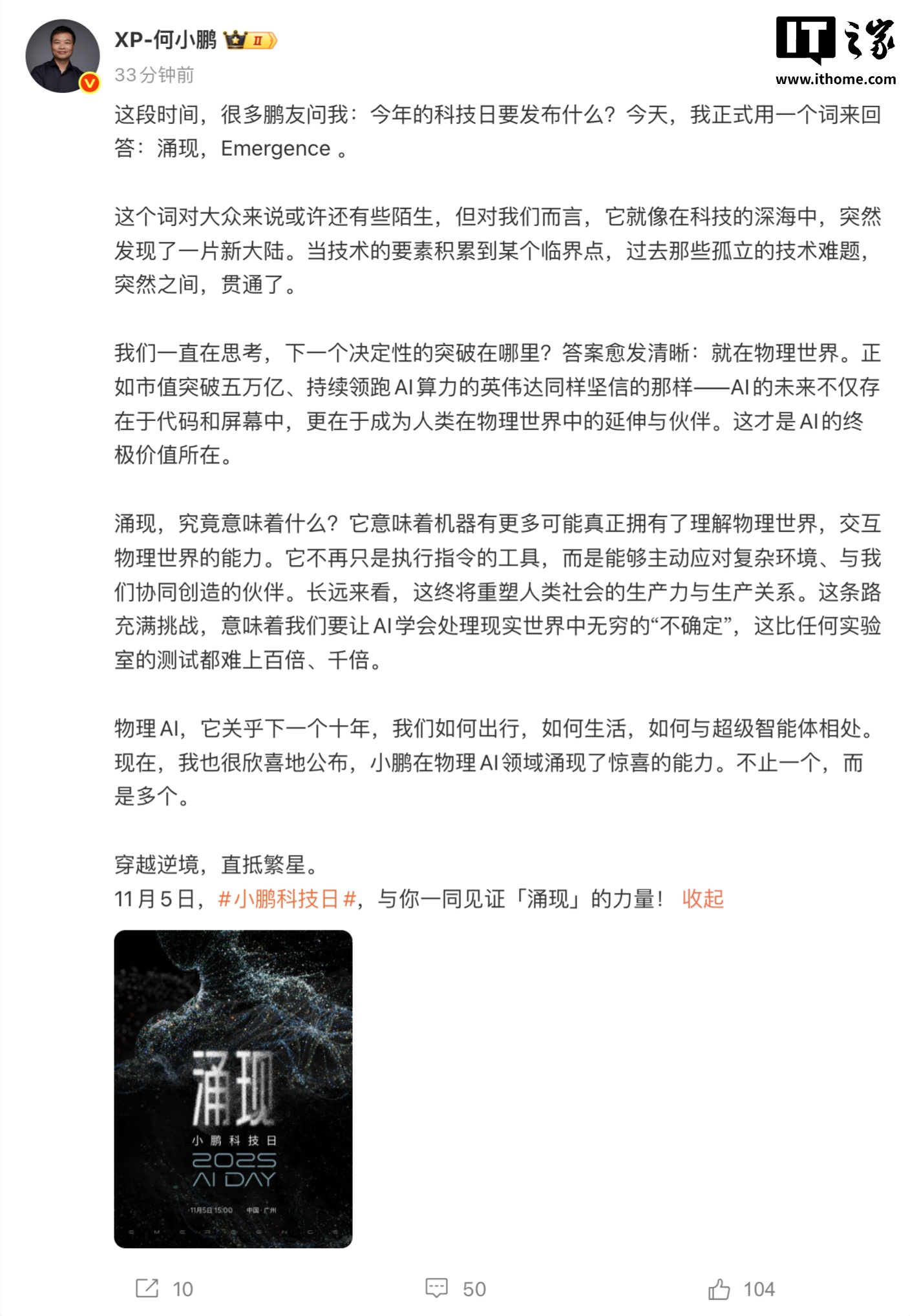 alixixi 10 月 30 日消息,今天上午,小鹏汽车董事长何小鹏在微博发文宣布:今年的小鹏科技日“2025 AI DAY”定档 11 月 5 日 15 时在广州举行。