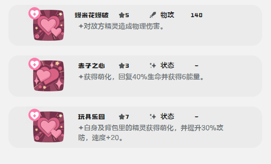 从输出方面来看,超级糖果就是绝对的主力,会有130威力的物理性伤害,这点还是很给力的,直接就可以获得一个萌化状态。触底强击也很有意思,魔法伤害基础大概是60个威力,要是放技能就刚好是能量耗尽。威力数值可以先加100打爆发还是比较好用的,另外还有一个迫近攻击。每一次在放完之后,威力就可以直接上涨20,叠加几次之后就可以直接叠满伤害,对于血厚的对手还是很管用的。
