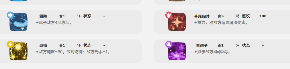 休息回复就可以直接回30%的血,作用于日常还是足够的。更厉害的是还有一个应激反应,普通的情况下大概就可以回25%的血,要是遇到对手防御反击,那就可以直接回80%的血。残血反打,那全部都需要靠他。另外还有一个赤子之心,不仅可以回40%的血,而且还可以获得6点能量。整体的性价比还是比较出色的,除此之外增益技能也是主要的亮点。柔弱可以把敌方的物理性攻击还有物理性防御直接下降70%就可以给我方创造出更多的机会。