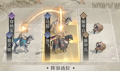 站位:注意让马超踩到张飞和蔡文姬的追击格,形成以马超为主C的阵型,同时让盾兵顶在前排,弓兵等输出兵种放在后排。