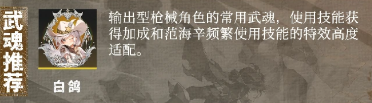 后期大家如果玩枪械类型的角色,就可以选择范海辛作为自己的操作角色,那么范海辛在输出的情况下为他搭配武魂的话,大家可以考虑的就是白鸽,白鸽这个武魂跟角色搭配在一起就可以带来一定的契合度,而且让他在释放技能的时候能够带来多频次的爆发概率,这里跟武魂的加成条件也是比较贴合的,如果大家跟他进行搭配的话,范海辛在自身定位上面也会有足够的加成。