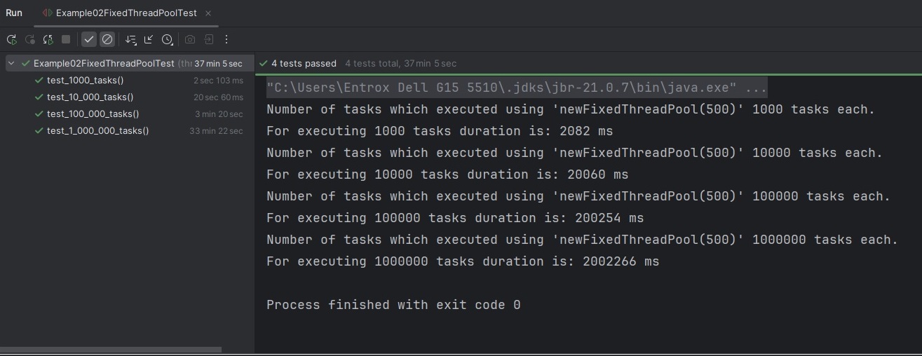 System.out.println("Number of tasks which executed using 'newFixedThreadPool(500)' " + NUMBER_OF_TASKS + " tasks each.");