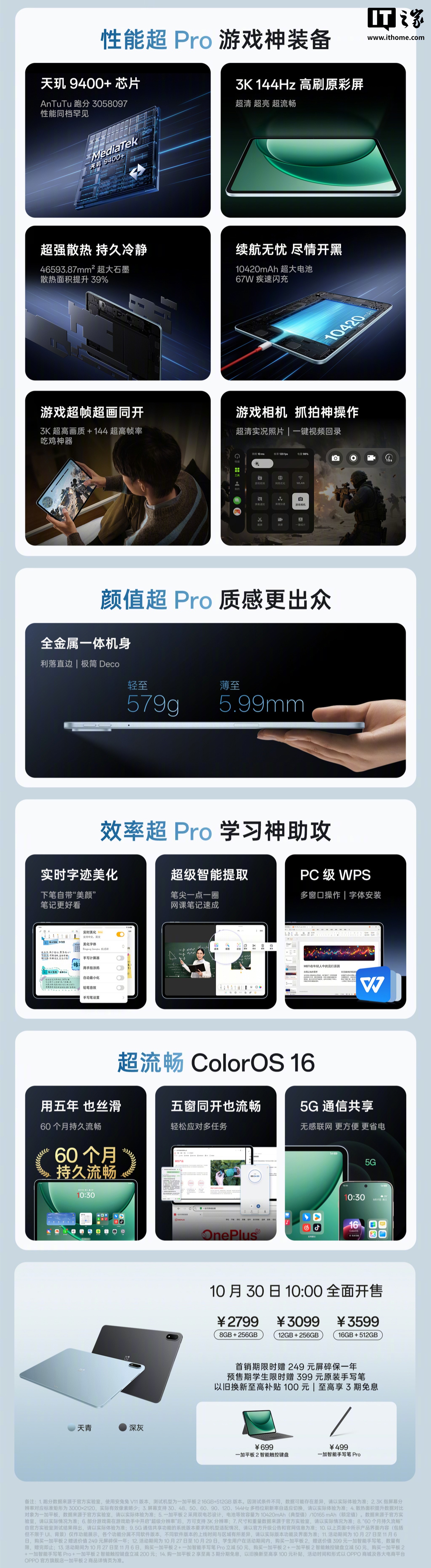 硬件方面,一加平板 2 搭载联发科天玑 9400+ 芯片,可带来“旗舰性能”,跑分超 305 万分,配合 46593.87mm² 的超大散热面积可实现更持久的性能释放,机身采用轻薄设计,重量是 579 克,厚度 5.99mm。
