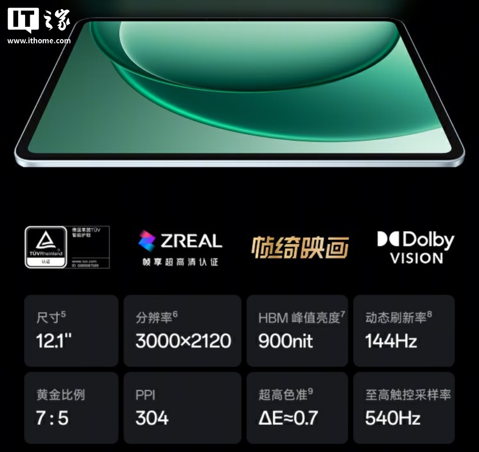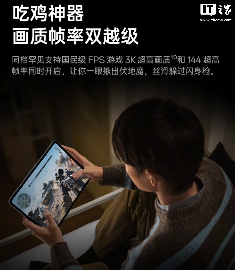 屏幕方面,这款平板搭载 12.1 英寸大屏,分辨率达 3K(3000*2120)、PPI(像素密度)304,HBM 峰值亮度为 900 尼特,支持 144Hz 动态刷新率,触控采样率至高 540Hz,支持部分手游 3K 超高画质 + 144 帧满血同开,号称“吃鸡神器”。