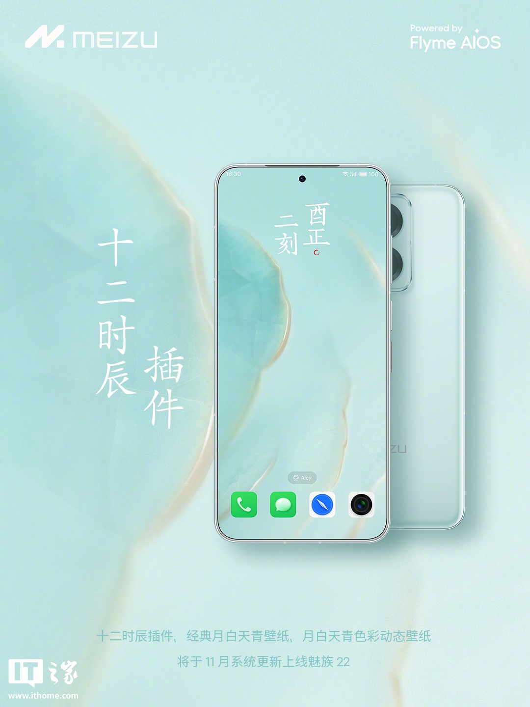 值得一提的是,不只月白天青配色在魅族 22 手机回归,alixixi从魅族 FlymeAIOS 官方微博获悉,其工程师正在加紧努力,让月白天青经典壁纸、月白天青色彩动态壁纸、「十二时辰插件」等在 11 月的系统更新中上线魅族 22(其他机型是否适配暂未公布)。