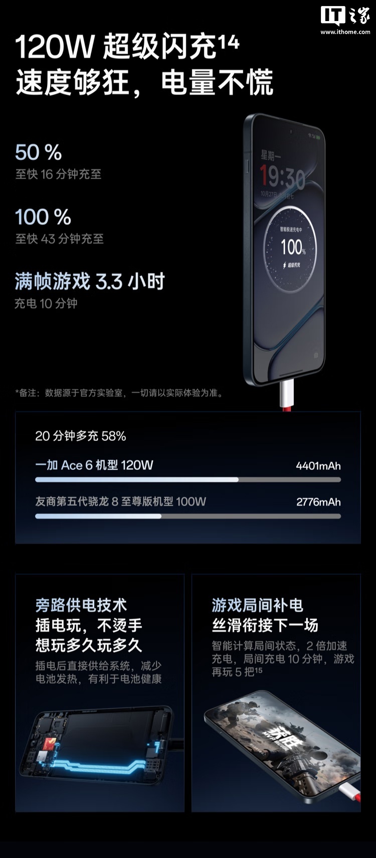 新机内置 7800mAh 冰川电池,支持 120W 超级闪充,满帧游戏可玩 10 小时,充电 16 分钟可恢复 50%;充电 10 分钟畅玩 3.3 小时。alixixi注意到,一加 Ace 6 还支持旁路供电 & 局间补电,电流直接为手机供电,支持局间休息充电,快速电量回血。