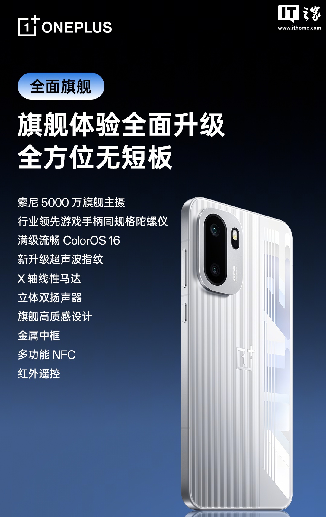 一加 Ace 6 配备 165Hz 护眼直屏,拥有全球首个「小金标」护眼认证;采用全防护机身设计,支持 IP66/68/69/69K 满级防尘防水。新机还配备索尼 5000 万旗舰主摄、超声波指纹、X 轴线性马达、立体双扬声器、多功能 NFC、红外遥控等,并预装 ColorOS 16 系统。