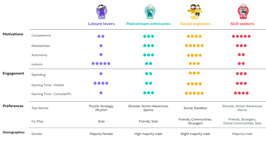 这项受众研究让你对经典的“玩家原型”有了最新的了解,但你也可以将其用作更智能设计和原型制作的路线图。通过使你的策略与驱动每个细分群体的动机保持一致,你可以构建出真正引起目标受众共鸣的体验。
