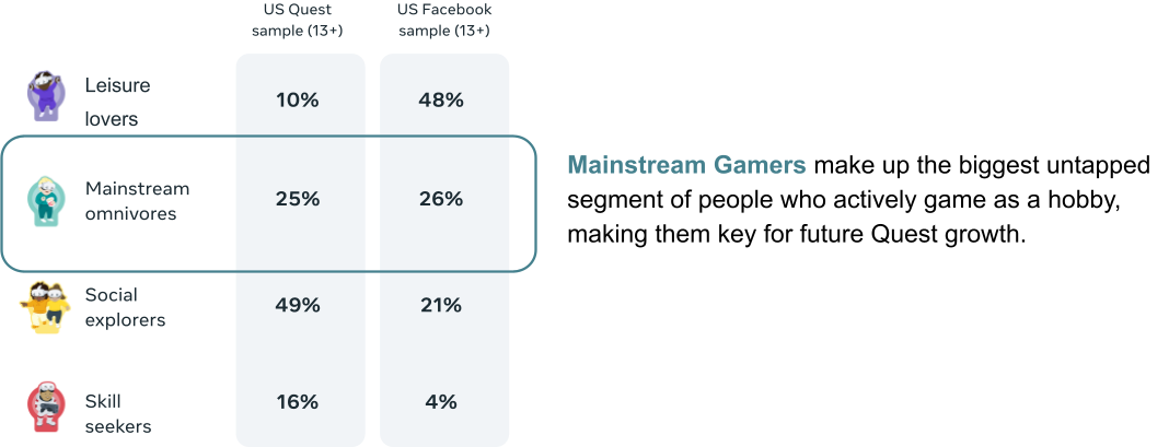 ·主流杂食者在Quest上具有很好的代表性,并且最有可能尝试各种不同的体验。这个群体代表了将新用户带入生态系统的最佳机会,因为他们享受将传统游戏作为爱好。为了吸引他们,我们正在投资于那些超越以精通为重点的体验(主要吸引技能追求者)的游戏,转而提供更全面、低风险的游玩体验。