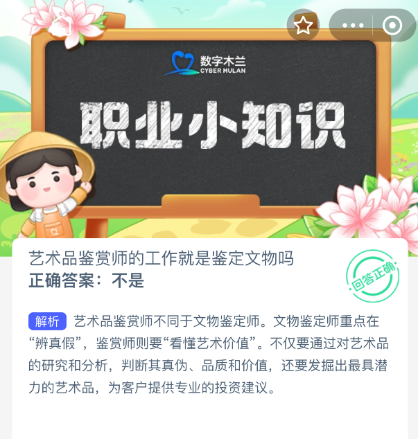 艺术品鉴赏师的工作就是鉴定文物吗?【蚂蚁新村每日一题】2025年10月30日题目已发布!坚持答题,积累木兰币,即可加速小镇建设。答对本题,立即可享“产速+3/时”的加速奖励!今天正确答案是【不是】。艺术品鉴赏师不同于文物鉴定师。文物鉴定师重点在“辨真假”,鉴赏师则要“看懂艺术价值”。