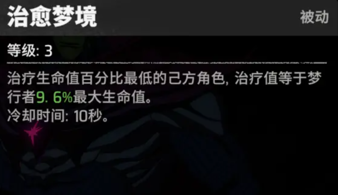 首先是治疗梦境。这个被动技能,那么它可以治疗生命值百分比比较低的角色,治疗值可以等于梦行者最大的生命值,机能的冷却时间为十秒钟,那么还有一个自动治疗,它的治疗量是和自己角色生命值相挂钩的,除此之外,还有攻击的技能,比如说扭曲梦境这个技能,可以带给大家特殊的伤害,这个终极技能也可以不断的释放能量消耗范围性是非常大的,之后就是梦之力,这个技能可以来不断的增加伤害,增加单次的技能,直到战绩全部消失之后,是对终极技能无效的,还可以增加单体角色释放梦境的能力。