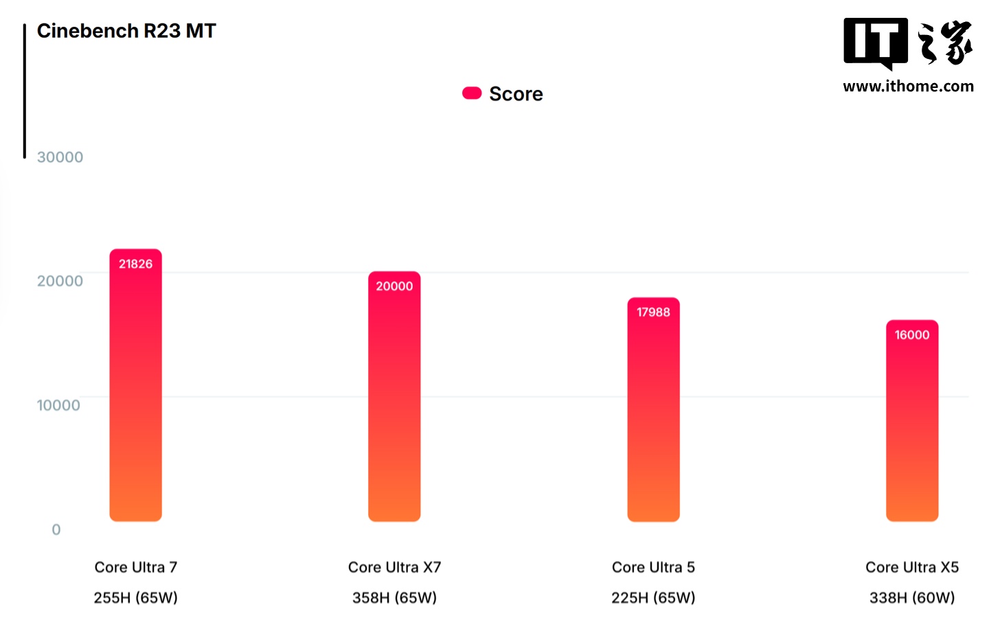 在核心的 CPU 性能测试中,Panther Lake 展示了令人意外的强大实力。在 Cinebench R23 多线程测试中,酷睿 Ultra X7 358H 在 65W 功耗下得分约 20000 分,仅略低于酷睿 Ultra 7 255H 的 21826 分。