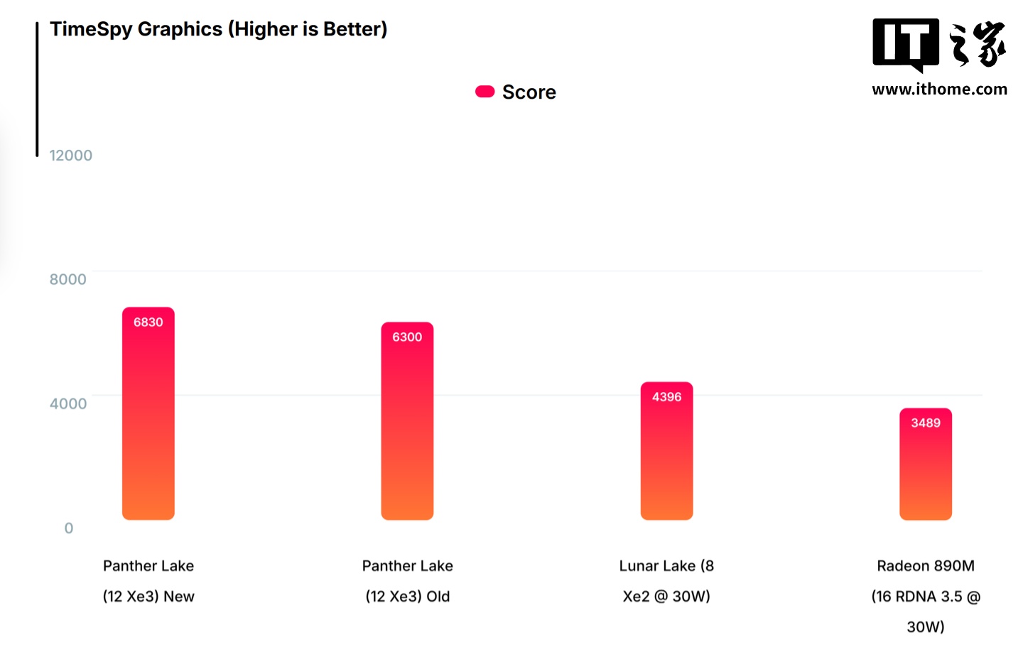 除了 CPU 部分,英特尔也增强了 Panther Lake 集成的 Xe3 核芯显卡性能。在 3DMark Time Spy 测试中,经过优化的 12 核 Xe3 iGPU 跑分从之前的 6300 分提升至 6830 分,增幅达 8.5%。