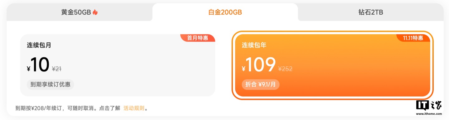 200GB 连续包年:原价 252 元,现直降 143 元,到手价 109 元