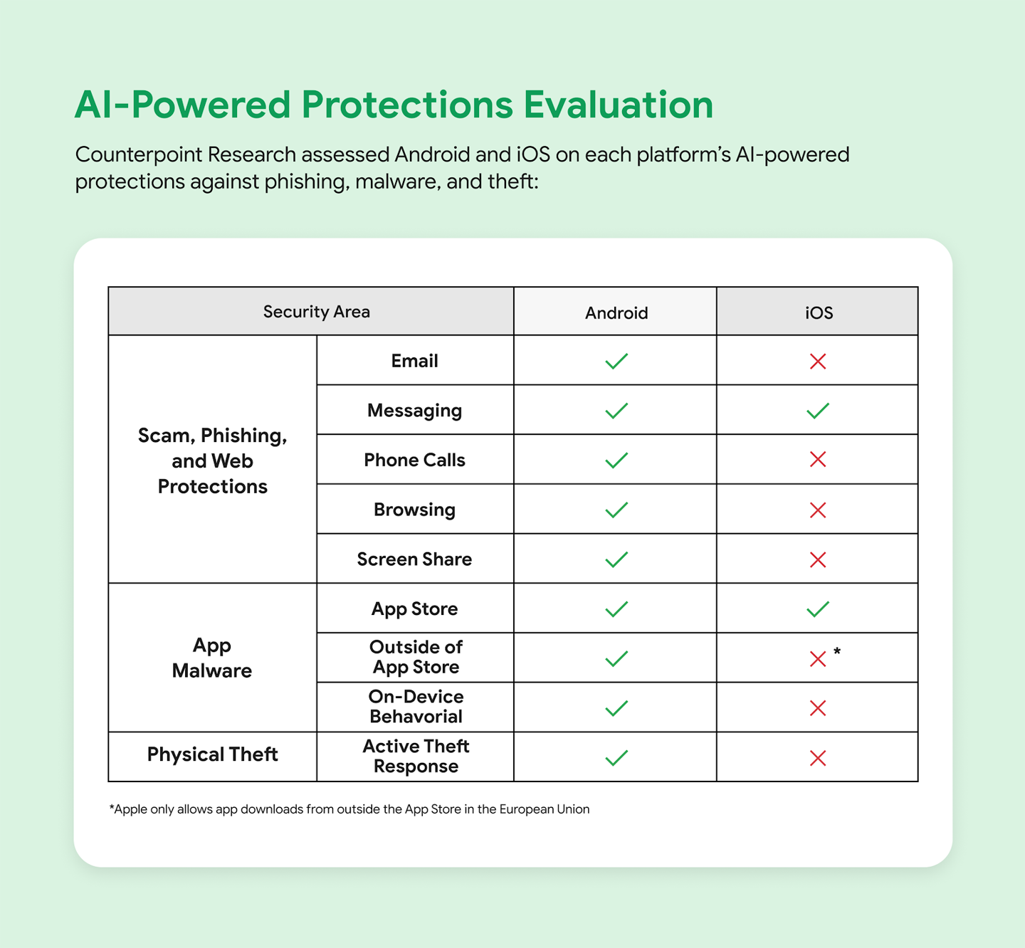 研究机构 Counterpoint Research 的一份报告指出,安卓设备可在九个关键安全层面上提供基于 AI 的防护,而 iPhone 仅覆盖了其中两个。