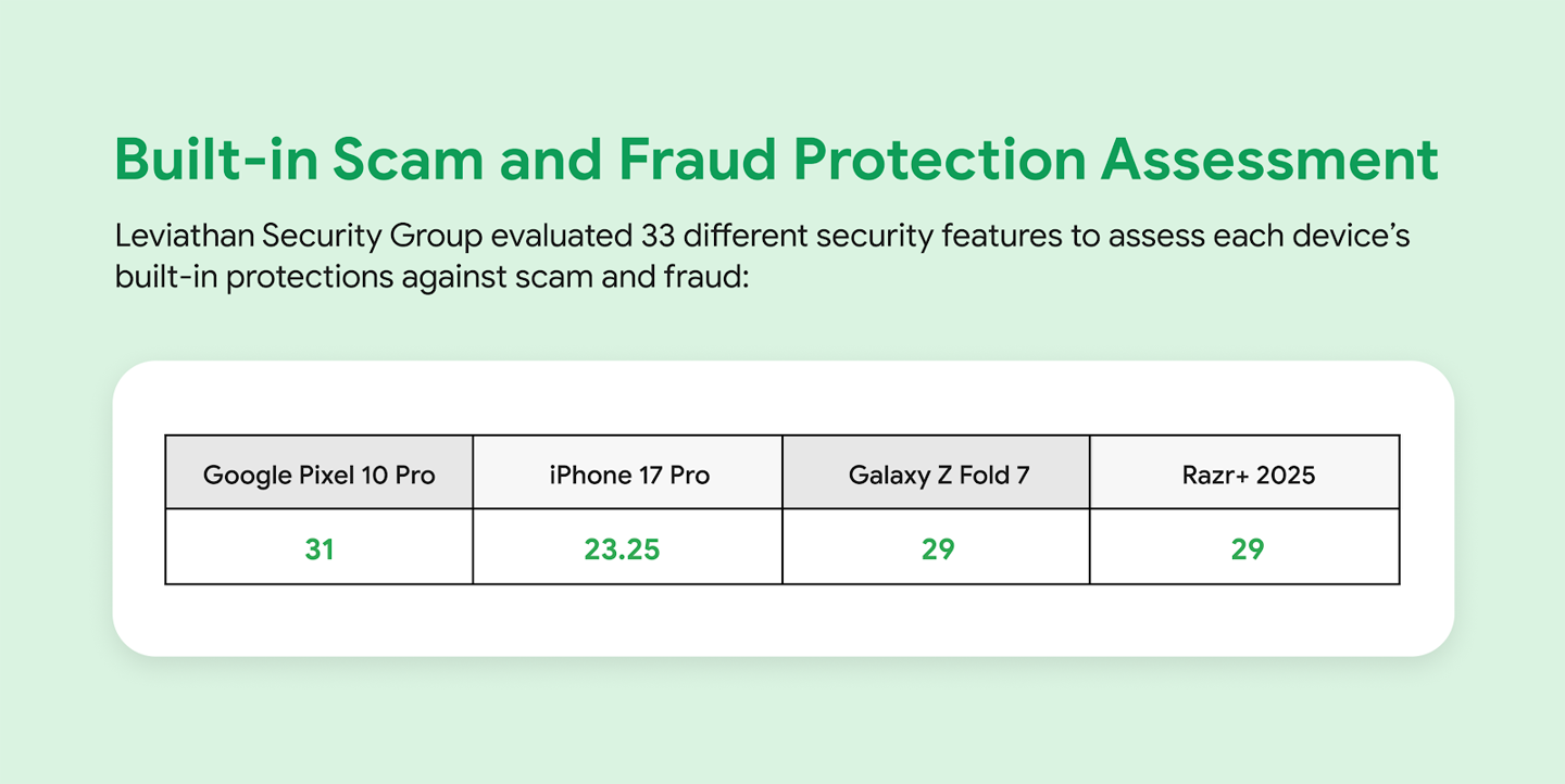 另一家安全公司 Leviathan Security Group 的评估结果更为直接,将 Pixel 10 Pro 列为默认诈骗防护能力最强的设备,领先于其他安卓旗舰机型和 iPhone 17 Pro。