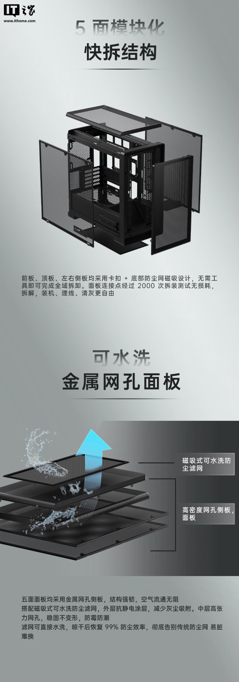 该机箱整体尺寸 452x242x458mm,采用五面大面积 Mesh 网孔面板设计,开孔占比达到 85%,官方称散热面积达 308200mm2,约为同级别机箱的 1.7 倍,结合底部通风孔形成多面环绕出风系统,为用户带来全域散热体验,减少局部积热。