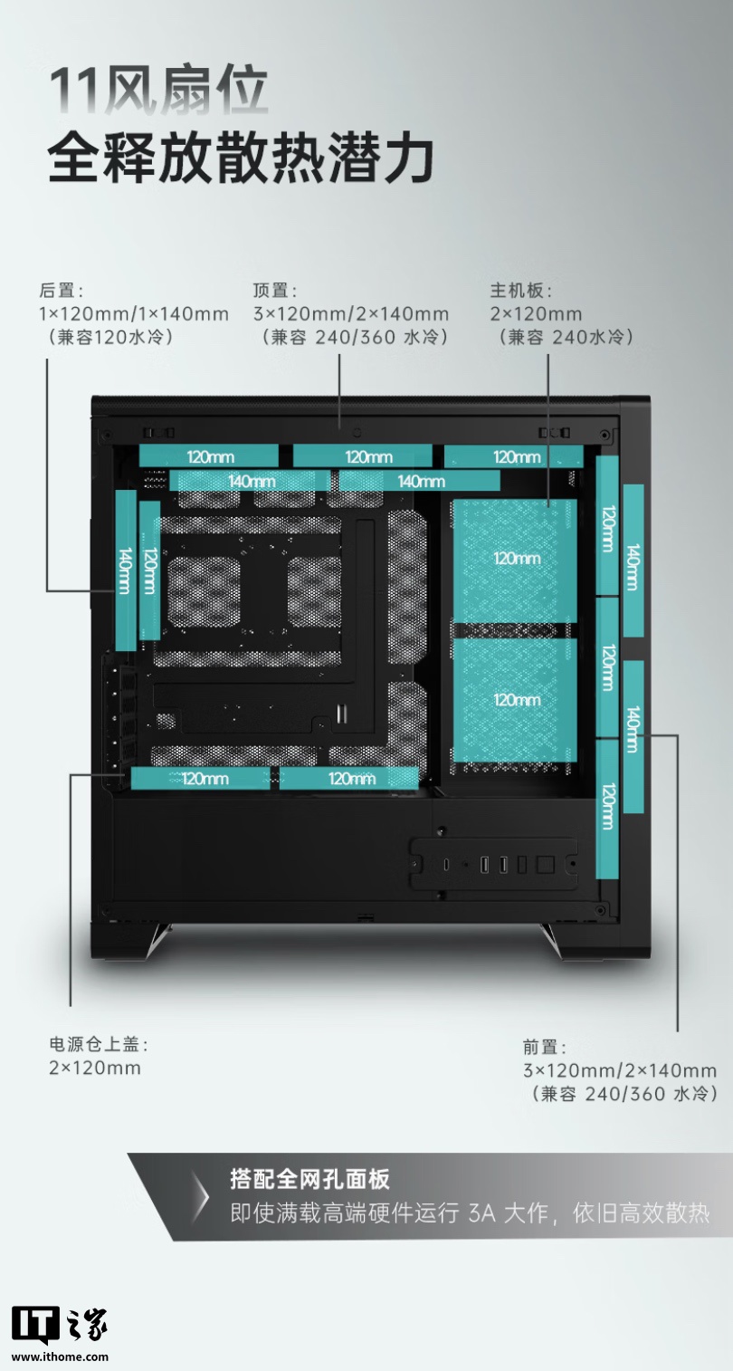 该机箱支持安装 mini-ITX / M-ATX 主板,最多可安装 11 把风扇,其中机箱顶部可安装 2 把 140mm / 3 把 120mm 风扇,前部可安装 2 把 140mm 或 3 把 120mm 风扇,尾部可安装 1 把 120mm / 140mm 风扇,侧板可安装 2 把 120mm 风扇,电源舱顶可安装 2 把 120mm 风扇。