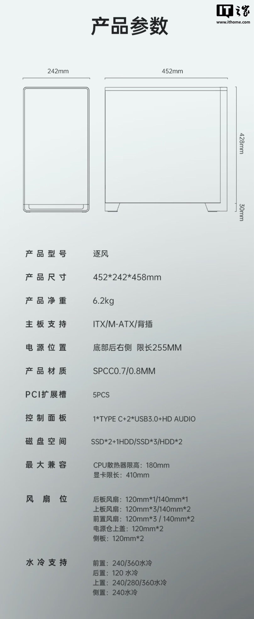 该机箱 CPU 散热器限高 180mm,显卡限长 410mm(前部不安装风扇),支持 ATX 电源(限长 255mm),I/O 方面提供 2 个 USB-A 5Gbps 接口、1 个 USB-C 10Gbps 接口、1 个 3.5mm 音频接口,alixixi附产品参数如下: