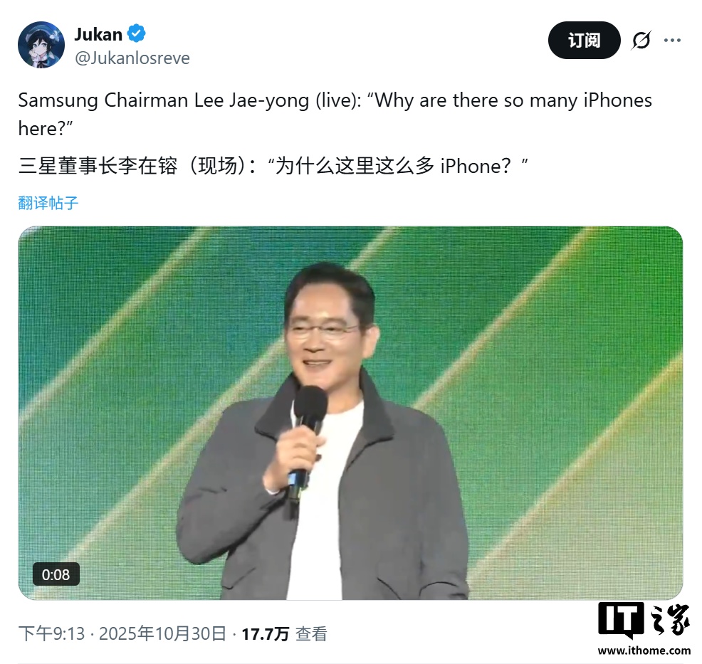 在首尔举行的 NVIDIA GeForce Gamer Festival 活动中,李在镕也上台,他环顾四周,注意到人群中有很多 iPhone 用户。他问道:“为什么这么多 iPhone 用户?”说完便大笑起来,人群也跟着笑了起来。