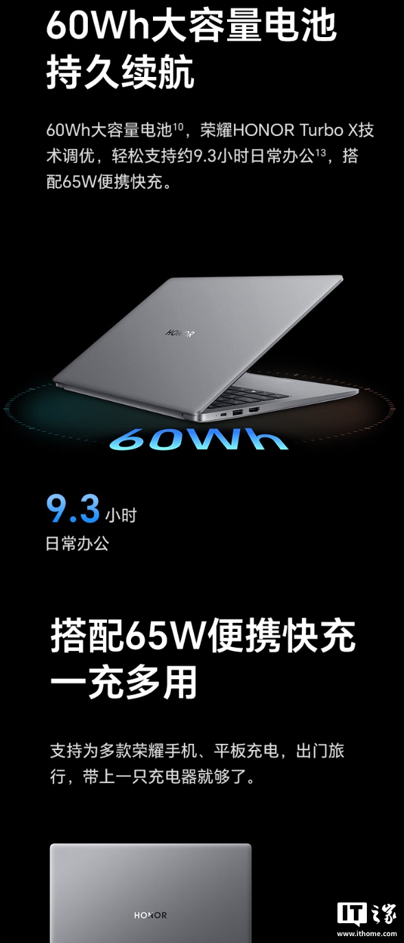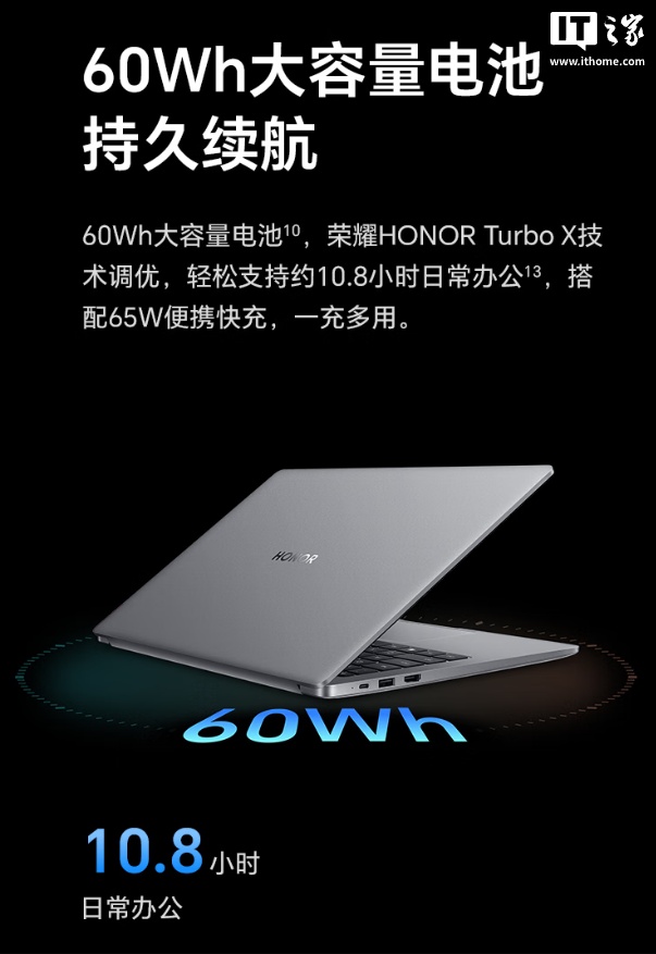 外观方面,这款笔记本重量 1.34kg,薄约 15.9mm,采用星空灰配色喷漆,搭载 60Wh 大容量电池,在 HONOR Turbo X 技术加持下,日常办公续航可达到 10.8 小时,搭配 65W 快充充电器,可为手机、平板等设备充电。